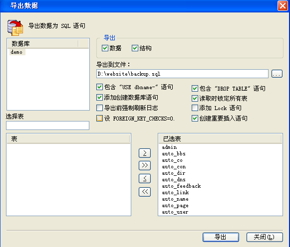 在導出到文件處填入你存入備份文件的路徑和文件名,然后點導出,即可完成數據庫的備份工作。
