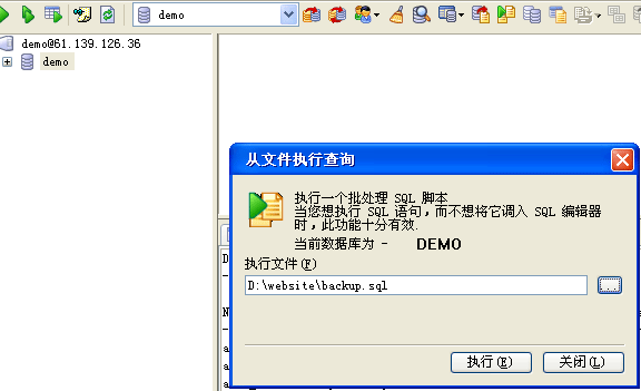 選擇您原來備份的Mysql數據庫的sql文件,然后點執行,即可完成數據庫的導入恢復工作。