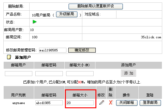 添加郵箱用戶的時候,在"郵箱大小"中輸入每個郵箱的大小即可,單位是M