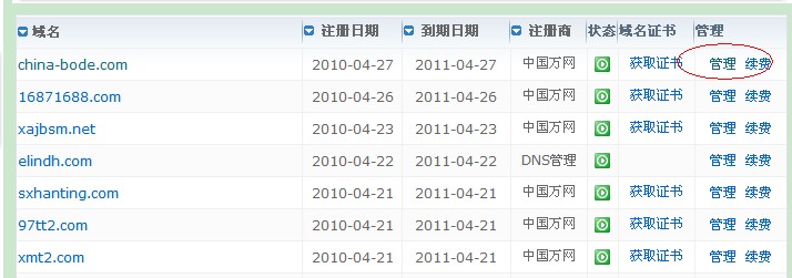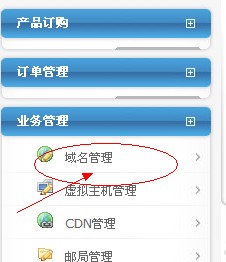 如果您的域名和主機(jī)都是在我司購(gòu)買(mǎi)的,請(qǐng)直接在虛擬主機(jī)上綁定域名,綁定的時(shí)候系統(tǒng)會(huì)自動(dòng)做好解析。 如果您的域名是在其他公司購(gòu)買(mǎi)的,在主機(jī)上綁定域名時(shí),系統(tǒng)會(huì)提示您解析方法: www.yourdomain.com 做別名(cname)至主機(jī)贈(zèng)送的二級(jí)域名。 以下是我司域名的手工解析辦法: 在管理中心管理域名 1.在管理中心菜單選擇 業(yè)務(wù)管理>域名服務(wù) 2.在域名列表中,選擇需要管理的域名。 3.進(jìn)入域名詳細(xì)信息頁(yè)面,可以看到有域名管理的各項(xiàng)菜單,我們先來(lái)看如果解析域名這個(gè)常用功能。進(jìn)入到dns解析管理操作解析。