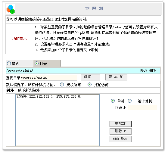 5. 整站設(shè)置為只讀(在控制面板中點文件管理),單獨把數(shù)據(jù)庫文件設(shè)置為完全控制權(quán)限。 我們的思路:防止木馬上傳-即使上傳了也不能執(zhí)行-即使有了權(quán)限也不能登錄后臺-即使能夠上傳我們也能很容易發(fā)現(xiàn)和清除。 通過以上組合設(shè)置,輕松打造史上最安全的網(wǎng)站!
