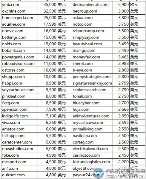 .com域名方面,本期超五位數美元成交的域名共有12個,其中三聲母域名ymb.com結拍價最高。該域名注冊于1996年9月,距今已超過20年歷史了。含義上,有“域名吧、玉米棒、亞麻布、羊毛被、韻母表、移民寶、易秒寶、益民寶”等諸多詞語,適合搭建域名、農業、電商、移民等做個行業終端,應用空間較大。 排在第二的是組合域名okchina.com,成交價為32,000美元,約合人民幣22萬元。“china”一詞既有“中國”之意,又有“陶瓷”的意思,所以okchina.com適合搭建國家形象網站、旅游平臺,也可搭建陶瓷類終端。 隨后是以25000美元成交的組合域名homeexpert.com,約合人民幣17萬元,直譯為“家庭專家、置業專家”。搜索發現,目前以“home expert”命名的終端不在少數,homeexpert.com可廣泛用來搭建房租租賃、家庭糾紛解決平臺、個人健康管理網站等。 除此以外,aquiline.com以17,999美元結拍,在英文中有“鷹的,鷹鉤狀的”之意。緊隨其后的是英文域名noovle.com,結拍價為16000美元,該域名對應了谷歌的合作伙伴——云解決方案服務商Noovle,其官網啟用域名noovle.it。另外,betkings.com(賭王)、noids.com(有妄想癥的人)、bobank.com(BO銀行)、powergenius.com(能量天才)均五位數美元成交。