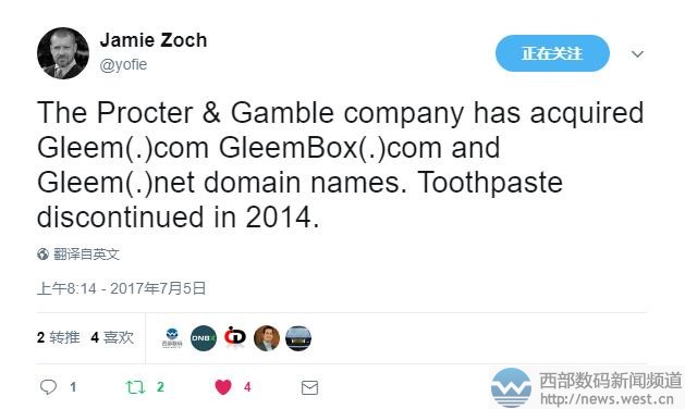 寶潔公司收購整套gleem相關域名!格利姆牙膏欲重出江湖?三五互聯(35.com)7月6日消息,據知名投資人Jamie Zoach曝料稱,全球最大的日用消費品公司——寶潔,近日一舉收購了gleem.com/.net以及gleembox.com三枚域名。有意思的是,gleem.com對應的寶潔旗下牙膏品牌,早在2014年便被寶潔公司放棄了。