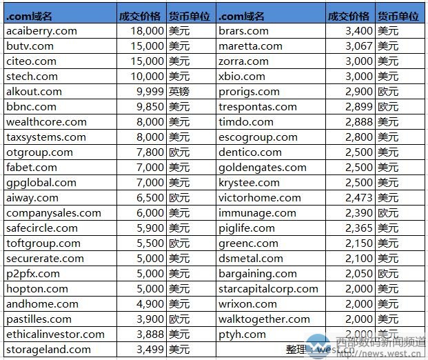 Sedo交易榜:“巴西莓”域名以12萬元領銜!終端買了個五字母citeo.com三五互聯(35.com)7月12日消息,最新一期的sedo交易榜出爐,本期上榜的域名共有56個,其中賣價最貴的是英文域名acaiberry.com,成交價為18,000美元,約合人民幣12萬元。