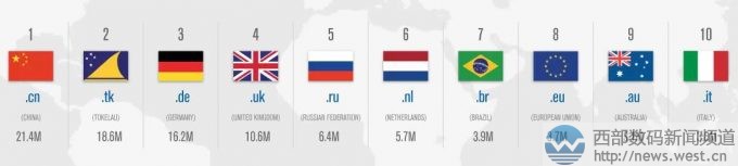國別域名方面,截止到2017年第一季度末,注冊總量為1.431億個,環比增長03.%,同比增長1.7%。其中,中國國家域名.cn注冊量突破2000萬,達到2140萬,是全球注冊量最大的國別域名。緊隨其后的是南太平洋島國.tk域名,注冊量為1860萬。接著是德國國家域名.de以及英國國家域名.uk。
