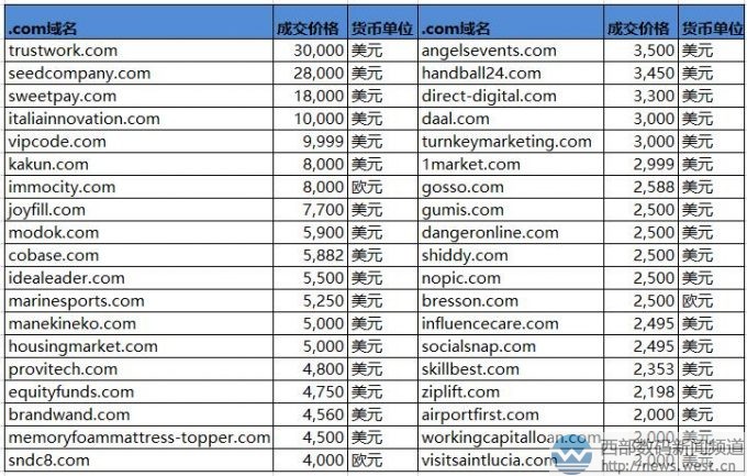 Sedo榜:“工作”類域名以20萬元領(lǐng)銜!3個(gè)新頂級(jí)域名表現(xiàn)搶眼!三五互聯(lián)(35.com)7月19日消息,最新一期的sedo交易榜出爐,本期上榜的域名共有65個(gè),其中賣價(jià)最貴的是英文域名trustwork.com,成交價(jià)為30,000美元,約合人民幣20萬元。