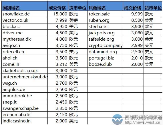國(guó)別域名方面,來自德國(guó)的域名snowflake.de以15,000歐元結(jié)拍,約合人民幣11.5萬元。其主體英文snowflake卻有“雪花、雪片”的中文含義,不少相關(guān)域名的成交價(jià)都不錯(cuò)。比如,snowflakedb.com曾在2014年被SnowFlake Computing(雪花計(jì)算)公司以近4萬元的價(jià)格收購;英文域名snowflake.co.uk也在今年5月底拍出了約10.6萬元的價(jià)格。 其他域名方面,本期三枚新頂級(jí)域名榜上有名。其中,token.sale有“代幣銷售”的意思,很適合搭建虛擬貨幣電商類平臺(tái),成交價(jià)為9,999歐元,約合人民幣8萬元。同樣適合虛擬貨幣領(lǐng)域的還有域名crypto.company,成交價(jià)為2,999美元,該域名有“加密公司”的意思,可用于加密貨幣平臺(tái)。除此以外,新頂級(jí)域名booze.club也以2000美元的結(jié)拍價(jià)上榜。 本文轉(zhuǎn)載自新聞資訊,原文鏈接:Sedo榜:“工作”類域名以20萬元領(lǐng)銜!3個(gè)新頂級(jí)域名表現(xiàn)搶眼!