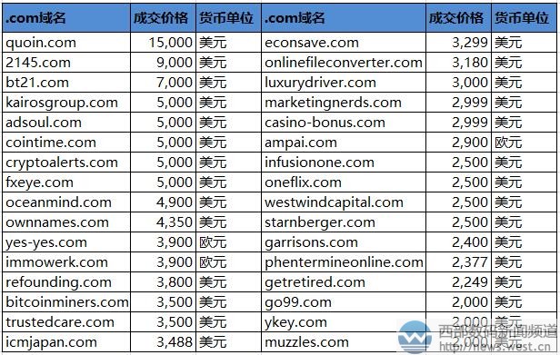 域名quoin.com注冊(cè)于2001年6月,是英文單詞“突角、隅石”的意思。從含義上看,該域名并沒有什么特別之處,不過卻對(duì)應(yīng)有軟件公司QuoinInc以及女性飾品品牌Quoin,由此可見可應(yīng)用的領(lǐng)域很廣。目前域名quoin.com被德國(guó)一家資訊網(wǎng)站收購(gòu),官網(wǎng)域名為t-online.de。 本期sedo榜上,.com域名表現(xiàn)平平。排名第二的數(shù)字域名2145.com成交價(jià)為9000美元,約合人民幣6萬元。該域名注冊(cè)于1999年,距今已經(jīng)18年歷史了,擁有一般四數(shù)字域名的短小精湛和建站不受限制等優(yōu)勢(shì),市場(chǎng)價(jià)值比較堅(jiān)挺。 隨后是雜米域名bt21.com,成交價(jià)為7000美元,從品相和含義上分析,該域名比較適合搭建比特幣交易及游戲平臺(tái)。除此以外,本期sedo上多個(gè)英文域名成交,比如cointime(硬幣時(shí)間)、adsoul.com(廣告靈魂)均以5000美元結(jié)拍。