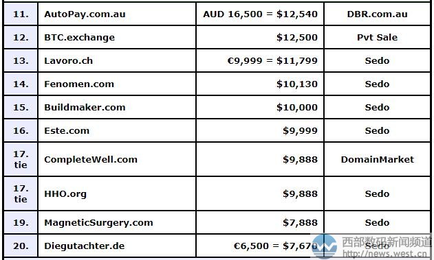 單字符j.de數(shù)量極為稀少,字母J在英文里有“jewelry”(珠寶)之意,在中文里對應有“家、金、價、酒”等諸多含義,而且可與之組合的詞語也十分多,應用空間相當廣闊。 緊隨其后的是三字母域名ani.com,拍出49,0000美元,約合人民幣32萬元。該域名注冊于1994年,距今已有23年歷史。該域名字符簡單好記,在英文里有“黑杜鵑”之意,同時還對應有法國巴黎的高端化妝品牌ani以及日本的anitoys動漫商城。目前訪問域名ani.com,發(fā)現(xiàn)該域名正在建站中,不過由于隱私保護的原因,終端買家的身份還不得而知。 德國域名風采當頭,澳大利亞域名也不甘落后。長尾域名urban.com.au以63,500澳元(48,260美元)成交,約合人民幣31.9萬元。主體urban是“城鎮(zhèn)、都市”的意思,適合搭建地方門戶網(wǎng)站。同樣榜上有名的澳大利亞域名還有autoPay.com.au,成交價為16,500澳元(人民幣8萬元),其含義為“自動支付”,天然適合搭建支付類平臺,用在金融領(lǐng)域很合適。 本期躋身前10的國別域名還有OCL.co.uk,成交為12,000英鎊,人民幣大概是11萬元。主體可以對應許多終端品牌縮寫,后綴為英國國家后綴,適合用來品牌升級。另外瑞士域名Lavoro.ch超1.1萬美元結(jié)拍,約7.6萬元。另一個德國域名Diegutachter.de結(jié)拍于6500歐元。 除了國別域名,兩枚數(shù)字域名也拍出不錯價格。其中,四數(shù)字的2906.com以21,900美元成交,約合人民幣14.5萬元;五數(shù)字域名97222.com則因品相突出也拍出13,000美元。這兩個域名字符都較為簡短,在全球范圍內(nèi)又屬于硬通貨,可廣泛用于金融、游戲、娛樂、門戶以及網(wǎng)址導航等多個平臺。 其他域名成交情況,詳見下表: