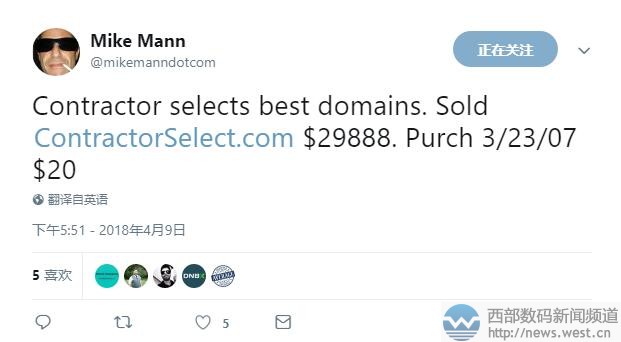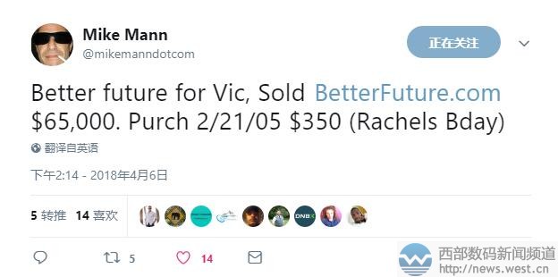大佬Mike Mann又出米:“美好未來”域名六位數(shù)成交!成本僅350美元!4月10日消息,就在幾小時(shí)前,國外域名大佬Mike Mann發(fā)推稱,以29,888美元出售了英文組合域名contractorselect.com,約合人民幣18.8萬元。另外,前兩天Mike Mann還以65,000美元售出了域名betterfuture.com,也再次讓大家見識了大佬不凡的銷售能力。