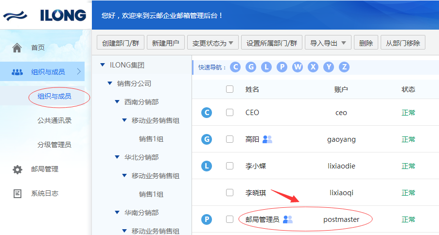 1、登錄企業郵局,點擊頂部“郵局管理”。在郵局管理中點擊“組織與成員”,在用戶列表中,點擊“郵局管理員”(postmaster)。