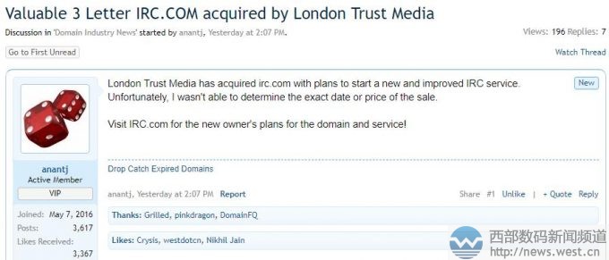 身價(jià)六位數(shù)美金?倫敦信托媒體收購三字母域名IRC.com6月25日消息,據(jù)國外米友在Namepros上曝料稱,三字母域名IRC.com日前被英國媒體公司London Trust Media Holdings(倫敦信托媒體控股公司)收購。外媒猜測,域名IRC.com可能達(dá)六位數(shù)美金。