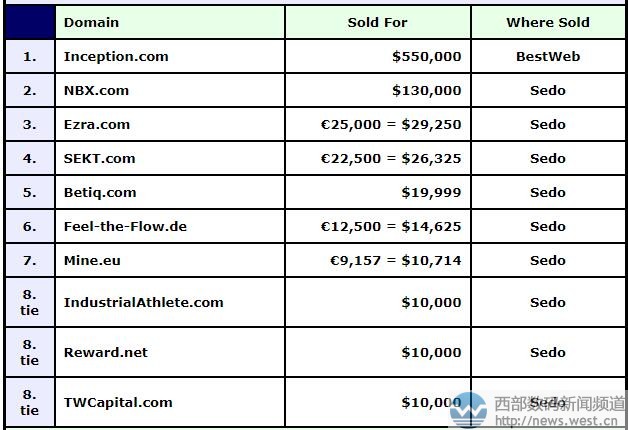 昂貴的“開端”:英文域名inception以366萬元居DN榜首7月13日消息,新一期的DN域名交易榜昨天出爐,本期榜單上超六位數美金成交的域名有兩枚,分別是inception.com(550,000美元)和NBX.COM(130,000美元)。