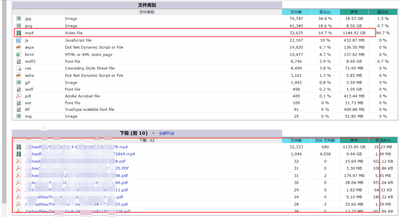 2.分析 經分析 訪問統計報表 ,主要是某個或幾個大文件被大量訪問,從造成流量暴增,如圖: