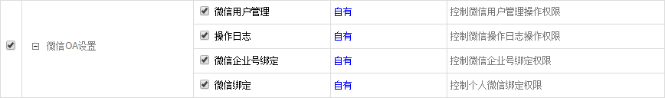 如圖所示,其中"微信綁定"權限提供給個人,進行個人微信號的綁定,可分配給每個用戶,另外三個權限開通給進行微信OA設置和管理的用戶即可(如下圖)。