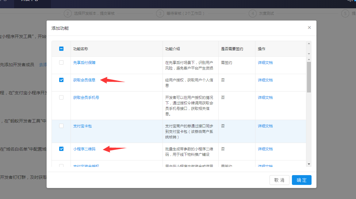 支付寶小程序發布指南一.前期準備1.注冊支付寶小程序商家需要在支付寶小程序平臺官網首頁(https://open.alipay.com/channel/miniIndex.htm)點擊“立即接入”按鈕,可使用現有支付寶賬號直接掃碼登陸支付寶小程序開發者平臺。 ![]() 登錄之后,需要完善信息才能創建小程序,注意要選擇“自研開發者” ![]() 2.小程序創建完成資料填寫后,可以在開發中心——小程序應用中創建小程序 ![]() 小程序信息填寫完畢后可進入查看并管理小程序。 ![]() 如果申請不通過,需要根據反饋信息重新完善資料提交 3.小程序功能添加支付寶小程序功能需要自行在支付寶小程序詳情中添加,在開發管理——功能列表中可以添加小程序功能,需要勾選添加“獲取會員信息”和“小程序二維碼”兩個功能。