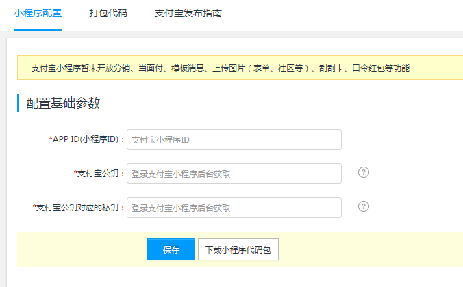二、小程序發布1.代碼包下載代碼包下載是在平臺上下載小程序代碼包,自行通過支付寶開發者工具上傳代碼并通過支付寶小程序平臺完成小程序審核、小程序發布操作。 1.1配置小程序參數登錄管理后臺,點擊【支付寶小程序】->點擊【小程序配置】,配置小程序的參數:AppID(小程序ID)、支付寶公鑰和小程序應用私鑰,AppID可登錄支付寶小程序后臺——小程序詳情頁直接獲取,小程序應用私鑰需要下載支付寶密鑰生成工具生成(下載鏈接:https://docs.open.alipay.com/291/105971/),支付寶公鑰需要將小程序應用公鑰上傳到支付寶小程序后臺獲取;