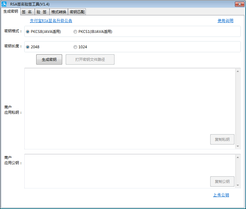 密鑰格式選擇“PKCS8(JAVA適用)”,密鑰長度選擇“2048”,點擊生成密鑰,即可生成小程序應用私鑰和小程序應用公鑰 ![]() 小程序應用私鑰用于填寫到平臺后臺,小程序應用公鑰用于填寫到支付寶小程序后臺獲取支付寶公鑰。 點擊“打開密鑰文件路徑”或者直接打開RSA密鑰的文件夾,亦可找到生成的小程序應用公私鑰。