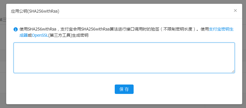 將1.2中生成的小程序應用公鑰填寫到輸入框中,點擊保存,保存小程序應用公鑰到支付寶小程序后臺。保存成功后,在同一頁面查看或修改應用公鑰或上傳應用公鑰證書。