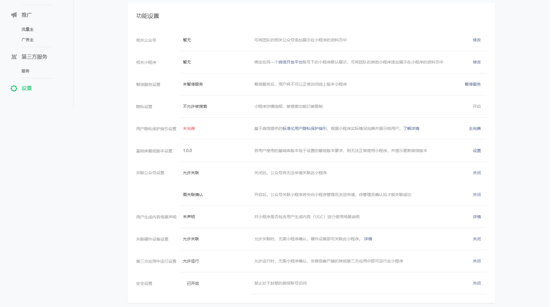 非代開發小程序用戶隱私保護配置非代開發小程序的用戶請登陸微信公眾平臺(https://mp.weixin.qq.com)在【小程序管理后臺-設置-功能設置-用戶隱私保護指引】自行配置 第一步:登錄小程序管理后臺在【設置-功能設置-用戶隱私保護指引】點擊【去完善】