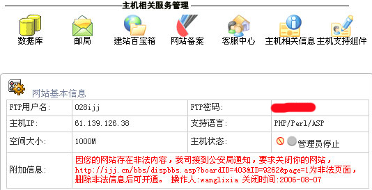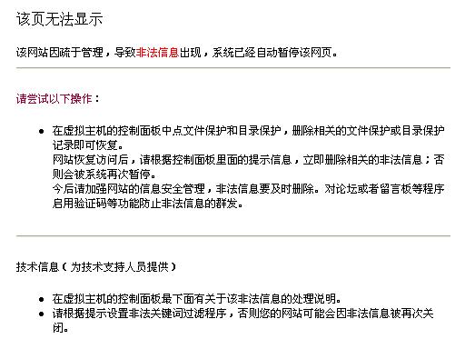 如果您的網站因管理不善多次出現非法信息或者出現重大非法信息,虛擬主機會被管理員關閉,