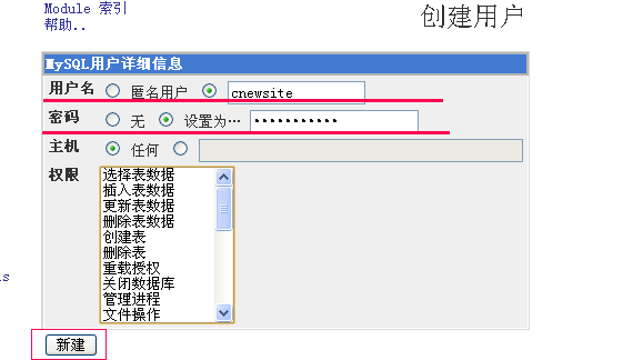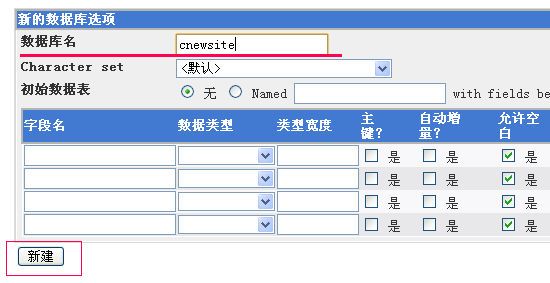 在"創建新的數據庫"表單中,僅輸入"數據庫名"即可,不用修改其它任何設置并點"新建"即可,一般推薦數據庫名和您的上傳用戶名相同,方便識別(如下圖)