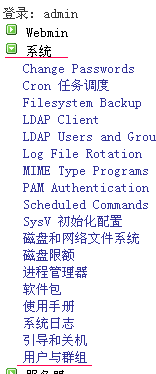 登錄webmin后,點擊"系統"-"用戶與群組"(如下圖)