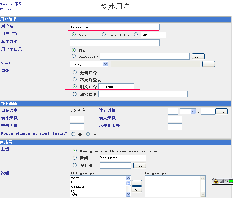 在"創建新用戶"表單中,輸入"用戶名",口令那兒選擇"明文口令"并輸入密碼即可,所有其它選項全部默認,并點新建即可.該用戶名與密碼即是FTP上傳用戶名與密碼.(如下圖)