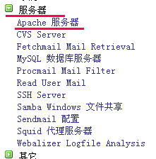 Linux下的網站服務是由Apache軟件來提供的,所以我們需要在webmin中點擊"服務器"-"Apache 服務器"(如下圖)