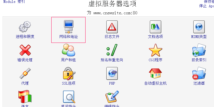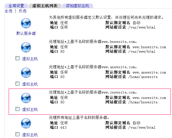 首先重新進入"Apache 服務器"管理,選中剛才添加的虛擬主機,點擊剛才添加的虛擬主機前邊的地球圖標(如下圖)