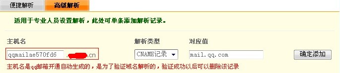 這個別名記錄是為了驗證郵箱所有權用的,主機名就是您開通域名郵局驗證那要求填寫的值。驗證成功后可以刪除。