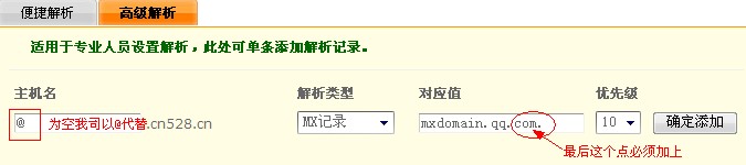 MX記錄的主機名填寫“@”,對應值填寫“mxdomain.qq.com.”記住最后有個點,優先級默認為10。