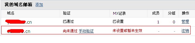 紅色圈起來的域名就是還在驗證中的,上邊已經有一個域名已經通過驗證,域名解析一般要半小時到一小時生效,新注冊的要24 小時才會完全生效,所以設置后請耐心等待域名解析和驗證生效。 網易域名郵局解析方法:http://www.shinetop.cn/faq/list.asp?unid=436