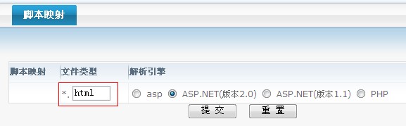 2、如果您想實現HTML靜態文件擁有ASP動態功能,在“文件類型”輸入框內填寫“html”,解析引擎選擇ASP即可。
