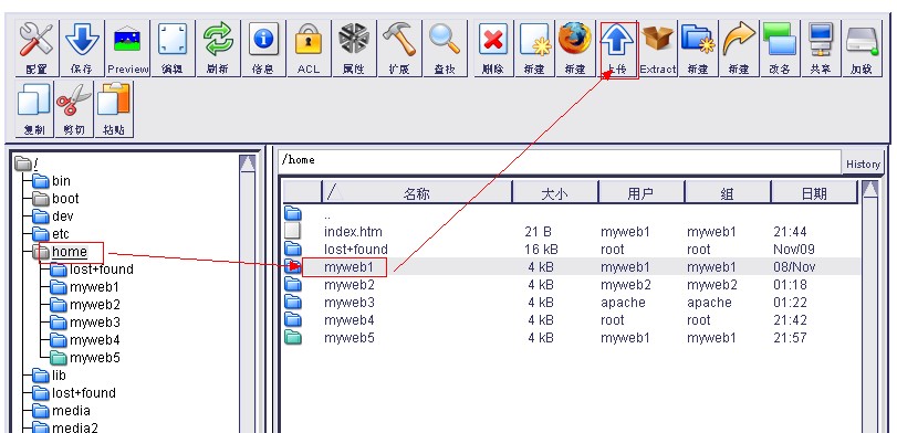 webmin文件管理器功能詳解webmin里的文件管理器有著強大的功能,為了方便不熟悉linux命令的用戶操作linux,在此對文件 管理器做一個詳細的介紹。 文件管理器功能需要java虛擬機支持,若您的webmin無法顯示,請下載微軟的java虛擬機,下載地址:http://www.java.com/zh_CN/download/windows_ie.jsp?locale=zh_CN 一、webmin文件管理器圖標介紹: 1、 2、 方便備份。 3、 4、 5、 6、 的子目錄。 7、 8、 9、 10、 11、 12、 13、 14、 包。 15、 16、 17、 18、 19、 20、 21、 22、 23、 二、 使用webmin上傳壓縮包并解壓,請確定您的壓縮包是zip或者tar或者tar.gz格式。1、點擊左側(cè)的“其他”--“文件管理器”,如圖: 2、選擇您需要上傳的文件夾位置,點擊上傳按鈕,如圖: