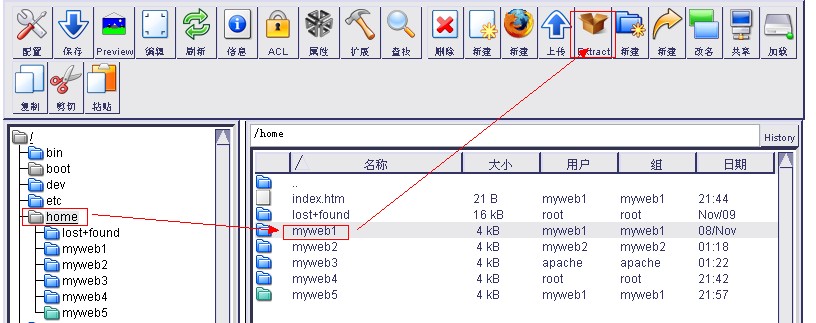 三、 使用webmin解壓壓縮包,請確定您的壓縮包是zip或者tar或者tar.gz格式。 1、登錄webmin,點擊“其他”--“文件管理器”,選中壓縮文件,然后點擊解壓按鈕,如圖: