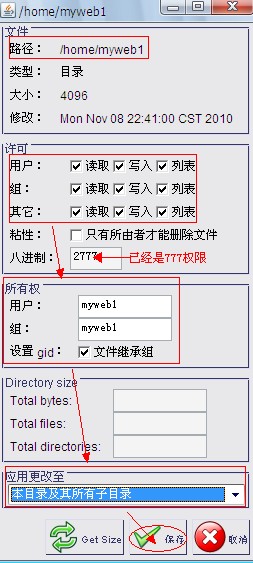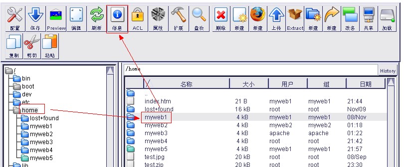 四、為文件或文件夾附加權(quán)限。 1、登錄webmin,點擊“其他”--“文件管理器”,選擇對應的文件或文件夾,然后點擊信息按鈕。如圖: 2、在信息窗口中,查看路徑是否正確,別將權(quán)限附加到其他位置,然后在許可中設置用戶、組、其他的權(quán)限,在所有權(quán)中設置 用戶和組名,應用更改至,一般選擇“本目錄及其所有子目錄”,這樣可以附加權(quán)限和所有者到每一個文件。如圖: