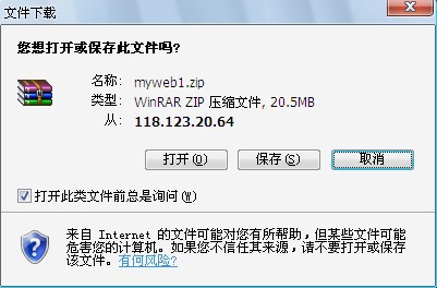 3、選擇文件格式后,頁面上會進入假死狀態(tài),實際上是服務器端在壓縮文件,不要做其他的操作,壓縮完成后 會彈出下載提示框,點擊保存即可下載到本地。如圖: 以上就是一些常用到的功能說明,太大的文件上傳,建議使用FTP,上傳后采用文件管理器的解壓功能進行解壓,然后設置權(quán)限, 并移動到正確的路徑下。