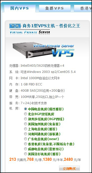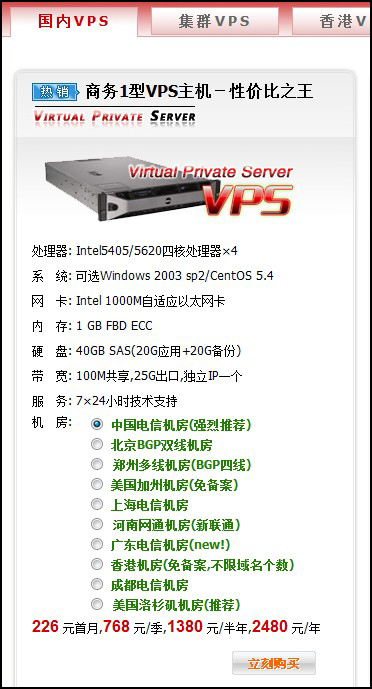 代理平臺如何開通VPS客戶在代理平臺開通VPS流程: 首先,客戶登陸代理平臺,在代理平臺上點擊“VPS主機”,選擇需要的類型和機房,點擊“立即購買”。如圖: