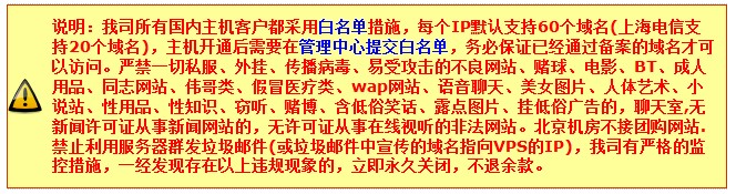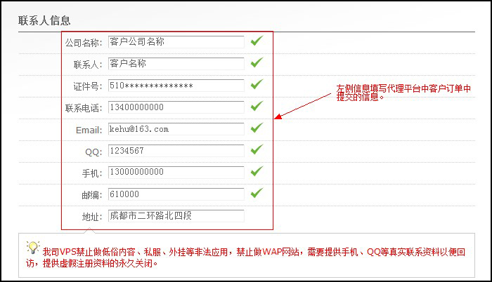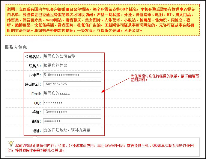 為保障服務質量,能在任何時候聯系到您,聯系人信息部分,請務必填寫真實有效信息,否則審核時VPS可能會斷網。 同時我司用紅色字體標注了不允許防止的內容,請仔細閱讀,一經發現違規內容將立即永久關閉。如圖: