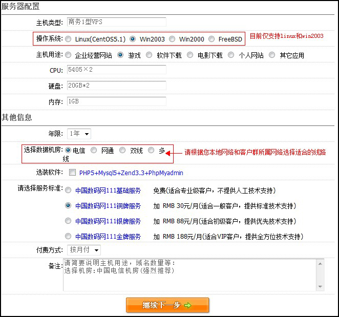 服務器配置部分,請選擇您需要的操作系統,目前我司僅支持linux(centos5)和win2003,選擇機房時,請根據您本地 的線路和客戶群的線路選擇適合的機房。選裝軟件請打鉤。如圖: