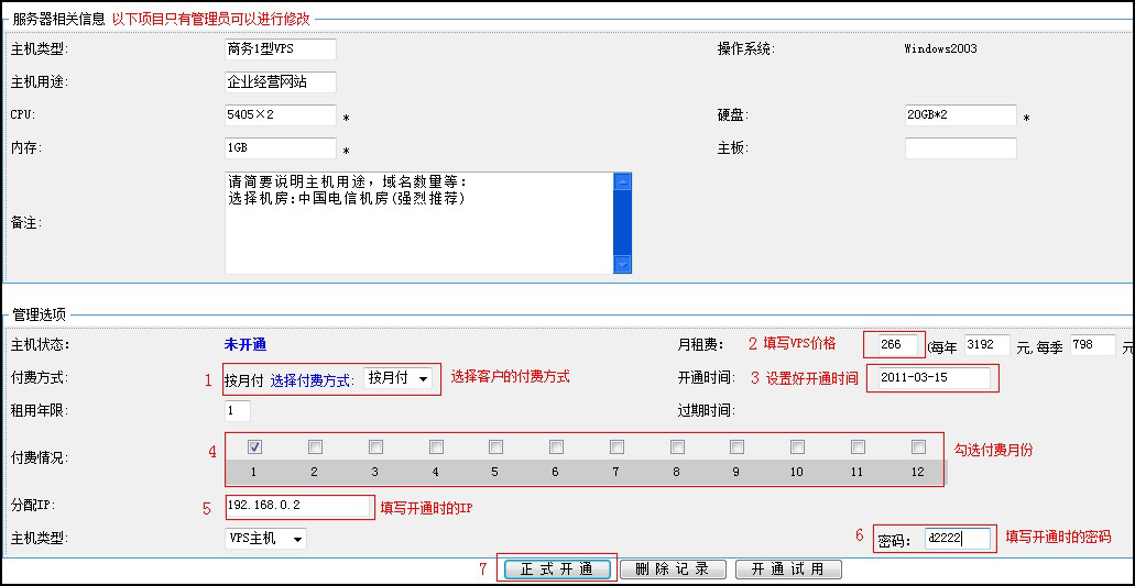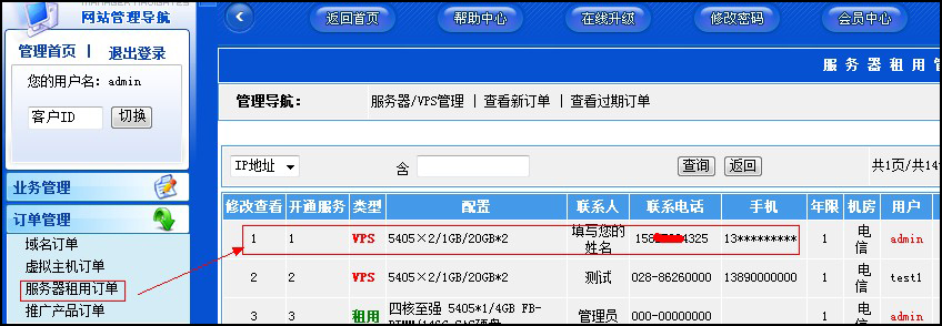 客戶在代理平臺提交訂單后,管理員可以登陸代理平臺后臺,在“訂單管理”—“服務器租用訂單”看到VPS的訂單,并按照訂單 要求在我司開通VPS。如圖(客戶訂單):