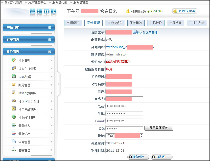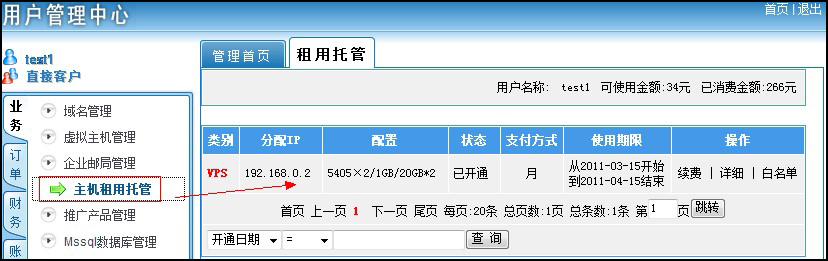 管理員開通后,客戶即可在自己的管理中心查看到相關的價格、到期日期、VPS登陸賬戶及密碼等信息,若要提交白名單和 更多管理,請點擊最右側的“白名單”或直接登錄www.myhostadmin.net。如圖: