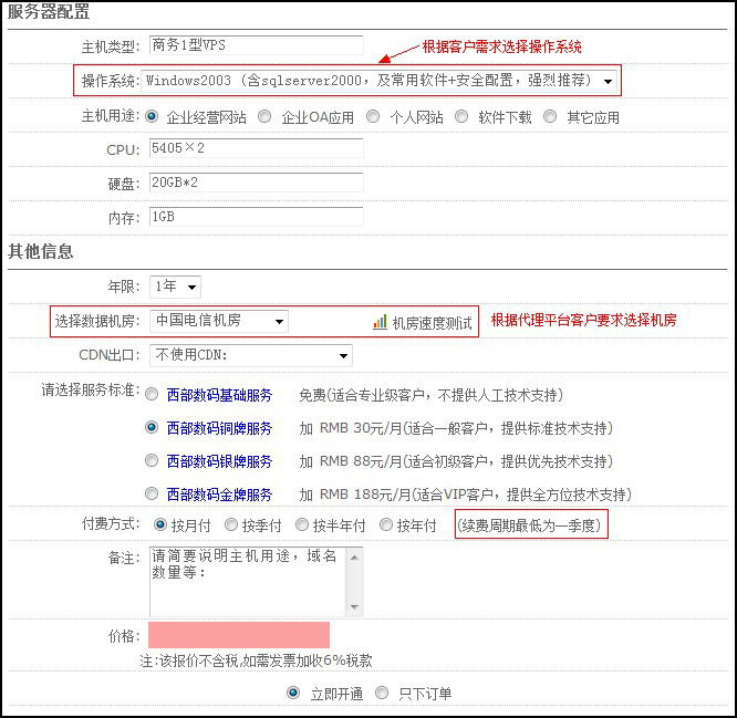 “服務器配置”部分,選擇操作系統時請根據客戶在代理平臺提交時選擇的類型來選擇。 “其他信息”部分,選擇機房時請根據客戶在代理平臺提交時選擇的線路來選擇。若您賬戶下有款可以點擊直接開通,若無足夠款項可以選擇只下訂單,然后勾選“我已閱讀并同意 三五互聯主機租用協議”。如圖(服務器配置和其他信息):