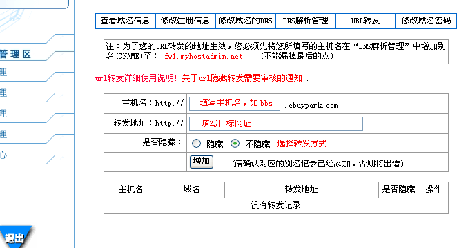 域名解析演示視頻 域名轉發演示視頻 URL轉發是指當用戶在瀏覽器輸入某個域名時,打開此域名對應的另外一個網址.例如,將http://bbs.ebuypark.com轉發到http://www.ebuypark.com/bbs時,用戶輸入bbs.ebuypark.com訪問的實際是www.ebuypark.com/bbs的內容. 轉發方式有兩種:隱藏與非隱藏,采用隱藏轉發時,用戶在瀏覽器地址欄看到的是原來的域名,如上例,用戶輸入bbs.ebuypark.com時訪問的雖是http://www.ebuypark.com/bbs的內容,但瀏覽器地址欄顯示的還是"bbs.ebuypark.com",而采用非隱藏轉發時,瀏覽器地址欄將顯示實際地址http://www.ebuypark.com/bbs.我司注冊的域名支持隱藏與非隱藏轉發,但隱藏轉發需要通過審核才能生效!