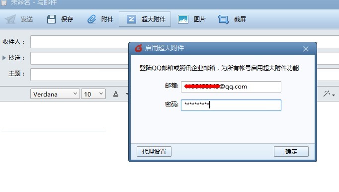 2. 進入寫郵件時,點擊“超大附件”,會提示您綁定QQ郵箱或者騰訊企業郵箱。我們綁定一個QQ郵箱即可。