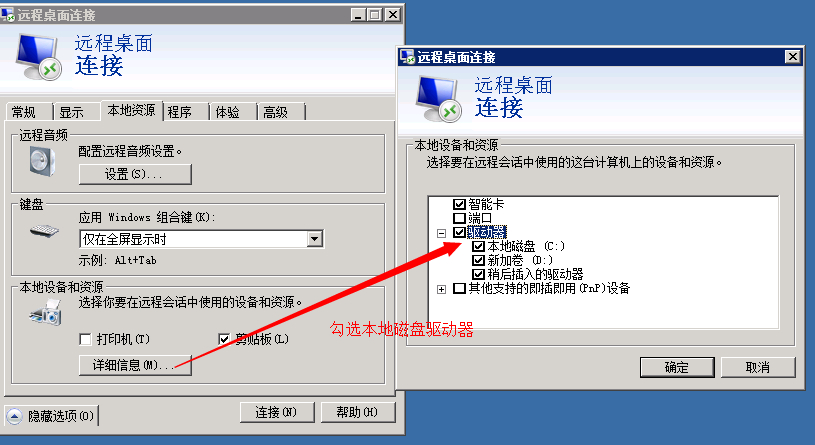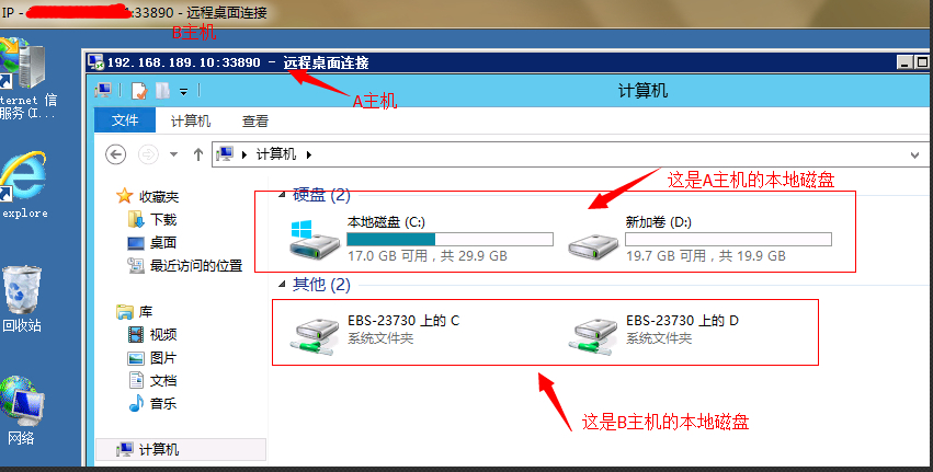進行登錄,進入A主機遠程桌面后就可以看到B主機的本地磁盤,數據就可以兩個主機磁盤之間直接進行拷貝: