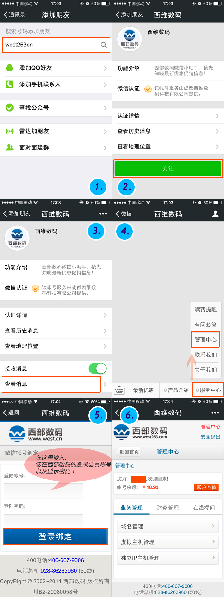 方法二:手工添加綁定。(不推薦,這樣添加的微信無法接收續費通知和驗證碼等消息) 打開微信手機,搜索:廈門三五互聯,點擊關注進入管理中心,系統將自動提示您輸入帳號密碼綁定!!