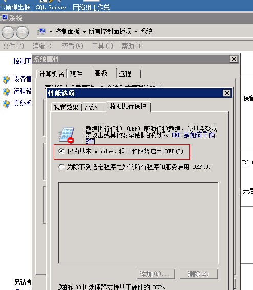 可能的原因有二種: 1.C:\Windows\Temp 目錄不能寫入緩存造成異常; 解決辦法:(1).刪除C:\Windows\Temp下所有文件,并且確定everyone完全控制此目錄。 (2).我的電腦/計算機”--屬性,高級-環境變量,TEMP改成d:\tmp,注意建立對應文件夾,并且給everyone完全控制權限。如果是更改TEMP需要重啟服務器才生效。 補充:C:\Documents and Settings\Administrator\Local Settings\Temp 也要檢查,是否有相應控制權限 cmd下運行: cacls "C:\Documents and Settings\Administrator\Local Settings\Temp" /T /e /g administrator:f cacls "C:\Documents and Settings\Administrator\Local Settings\Temp" /T /e /g everyone:f 2.可能是開啟數據保護原因造成。 解決: 3.D盤空間占滿,會報錯:本地數據庫無法使用,本次操作會受影響