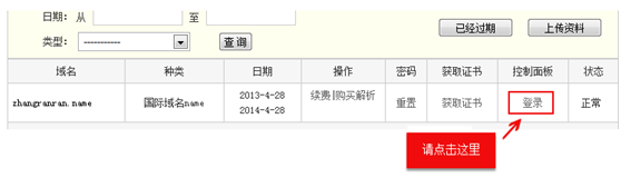3.進入域名管理頁后,在頁面右側下方找到修改DNS的域名,并點擊【登錄】,登錄控制面板。